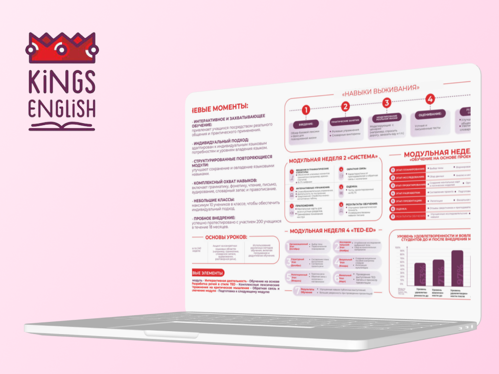 Мультимодульная мнемо-когнитивная программа KINGS ENGLISH — это современная система обучения, созданная как альтернатива устаревшим подходам. Методика описана в международной научной публикации European Researcher (2025) и успешно внедрена в практику центра KINGS ENGLISH с 2020 года. Программа прошла апробацию на 408 студентах разных возрастов и уровней подготовки, что подтверждено данными наблюдений, диагностики и анкетирования.